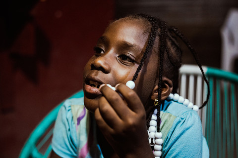 Una bambina gioca con le perline che decorano i suoi capelli